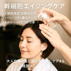 OASIS HAIR DESIGNでは、シャンプー後に**植物幹細胞エキス(リンゴ・エーデルワイス・椿・フウランなど)**を配合した美容液を髪と頭皮に塗布。コーミングで均一に行き渡らせた後、トリートメントを重ねて5分間しっかり浸透させます。